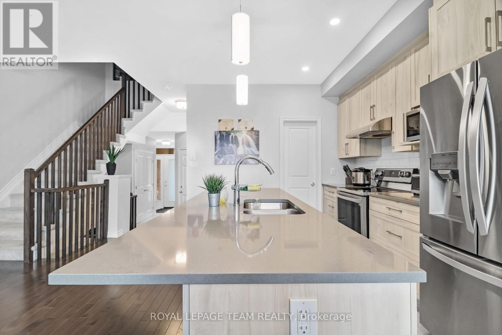 Welcome to a beautiful Tamarack-built townhouse nestled in the sought-after Cardinal Creek Village in Orleans, ideally located close to parks and family-friendly amenities. As you step through the front door, you are greeted by a spacious and inviting living and dining area, perfect for both everyday living and entertaining. The main floor also features a modern kitchen complete with a large island, stainless steel appliances, a convenient powder room, and direct access to the garage. From the main level, step out into a beautiful backyard, offering the perfect space for outdoor relaxation and gatherings. On the second level, you will find a well-designed layout offering three generously sized bedrooms, including a primary bedroom with a large walk-in closet and a private ensuite. This level also includes a convenient laundry room equipped with a pedestal and additional storage space. Two additional bedrooms and another full bathroom complete the upper floor. The fully finished basement adds valuable extra living space, ideal for a family room, home office, or recreation area. Don't miss out-book your private showing today! (id:37684)
